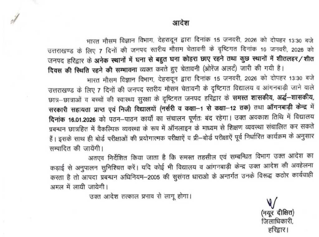 भारत मौसम विज्ञान विभाग, देहरादून द्वारा दिनांक 15 जनवरी, 2026 को दोपहर 13:30 बजे उत्तराखण्ड के लिए 7 दिनों की जनपद स्तरीय मौसम चेतावनी के दृष्टिगत विद्यालय व आंगनबाड़ी जाने वाले छात्र-छात्राओं व बच्चों की स्वास्थ्य सुरक्षा के दृष्टिगत जनपद हरिद्वार के समस्त शासकीय, अर्द्ध-शासकीय, सरकारी सहायता प्राप्त एवं निजी विद्यालयों (नर्सरी व कक्षा-1 से कक्षा-12 तक) तथा ऑगनबाड़ी केन्द्र में दिनांक 16.01.2026 को पठन-पाठन कार्यों का संचालन पूर्णतः बंद रहेगा। उक्त अवकाश तिथि में विद्यालय प्रबन्धन छात्रहित में वैकल्पिक व्यवस्था के रूप में ऑनलाइन के माध्यम से शिक्षण व्यवस्था संचालित कर सकते हैं। इसके साथ ही बोर्ड परीक्षाओं की प्रयोगात्मक परीक्षाऐं व प्री-बोर्ड परीक्षाऐं पूर्व निर्धारित कार्यक्रम के अनुसार सम्पादित की जायेंगी।