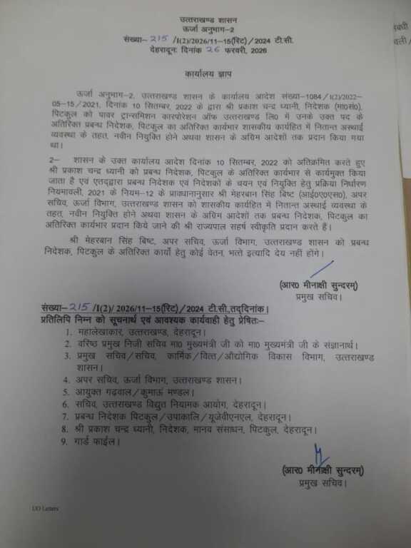 ऊर्जा अनुभाग-2. उत्तराखण्ड शासन के कार्यालय आदेश संख्या-1084/1(2)-2022-05-15/2021, दिनांक 10 सितम्बर, 2022 के द्वारा श्री प्रकाश चन्द्र ध्यानी, निदेशक (मा०सं०). पिटकुल को पावर ट्रान्समिशन कारपोरेशन ऑफ उत्तराखण्ड लि० में उनके उक्त पद के अतिरिक्त प्रबन्ध निदेशक, पिटकुल का अतिरिक्त कार्यभार शासकीय कार्यहित में नितान्त अस्थाई व्यवस्था के तहत, नवीन नियुक्ति होने अथवा शासन के अग्रिम आदेशों तक प्रदान किया गया था।