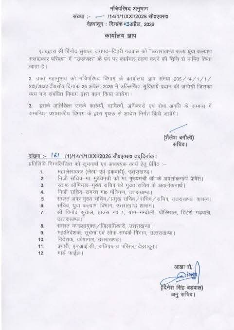 एतद्द्वारा श्री विनोद सुमाल, जनपद टिहरी गढ़वाल को उत्तराखण्ड राज्य युवा कल्याण सलाहकार परिषद में उपध्यक्ष के पद पर कार्यभार ग्रहण करने की तिथि से नामित किया जाता है।