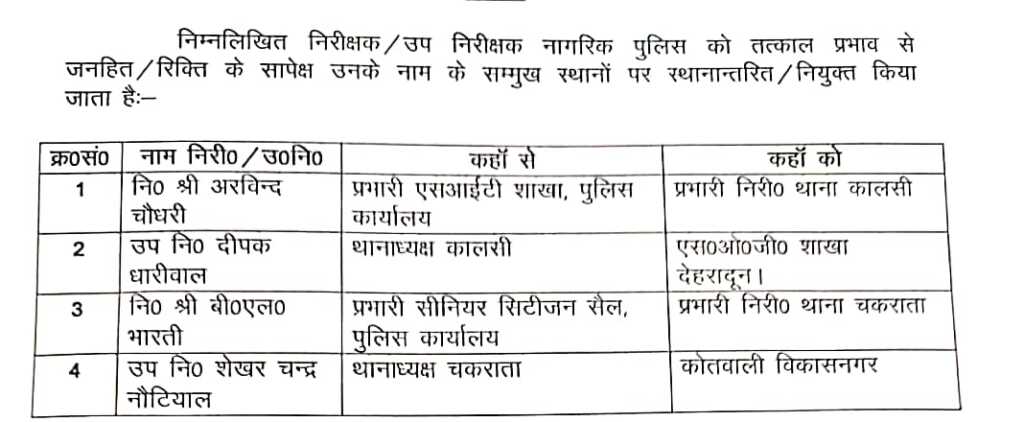 जारी आदेश के अनुसार निरीक्षक अरविन्द चौधरी को प्रभारी एसआईटी शाखा, पुलिस कार्यालय से स्थानांतरित कर प्रभारी निरीक्षक थाना कालसी नियुक्त किया गया है। वहीं उप निरीक्षक दीपक घारिवाल को थाना कालसी से हटाकर एसओजी शाखा देहरादून भेजा गया है