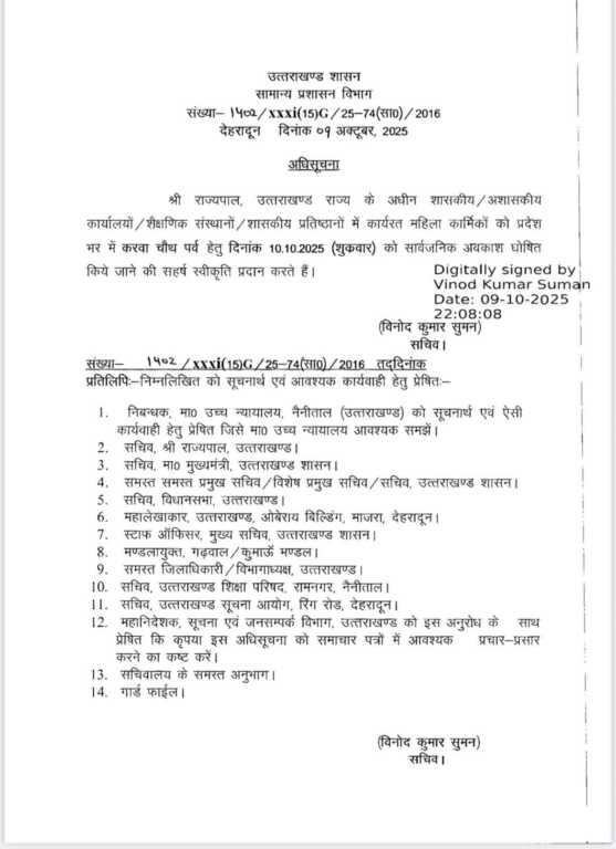 प्रदेश सरकार के अधीन शासकीय अशासकीय कार्यलय, शिक्षा संस्थान और प्रतिष्ठान में कार्यरत महिलाओ को दिन शुक्रवार करवा चौथ पर्व हेतु अवकाश घोषित किया गया है!!
