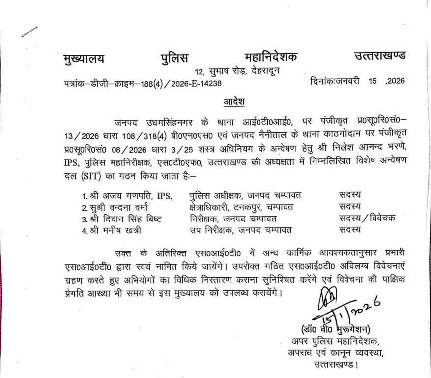 ▪️उक्त प्रकरण से सम्बन्धित अभियोगों की गहन विवेचना हेतु *पुलिस महानिरीक्षक एसटीएफ श्री नीलेश आनन्द भरणे* की अध्यक्षता में *5 सदस्यीय विशेष अन्वेषण दल (SIT)* का गठन किया गया है। SIT में पुलिस अधीक्षक चम्पावत- श्री अजय गणपति, क्षेत्राधिकारी टनकपुर- सुश्री वन्दना वर्मा, निरीक्षक श्री दिवान सिंह बिष्ट, जनपद चम्पावत एवं उपनिरीक्षक श्री मनीष खत्री, जनपद चम्पावत को सम्मिलित किया गया है।