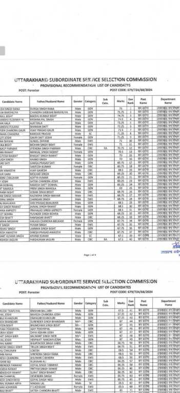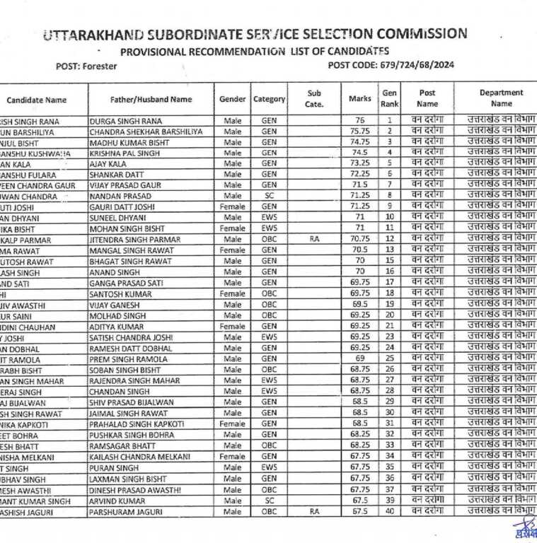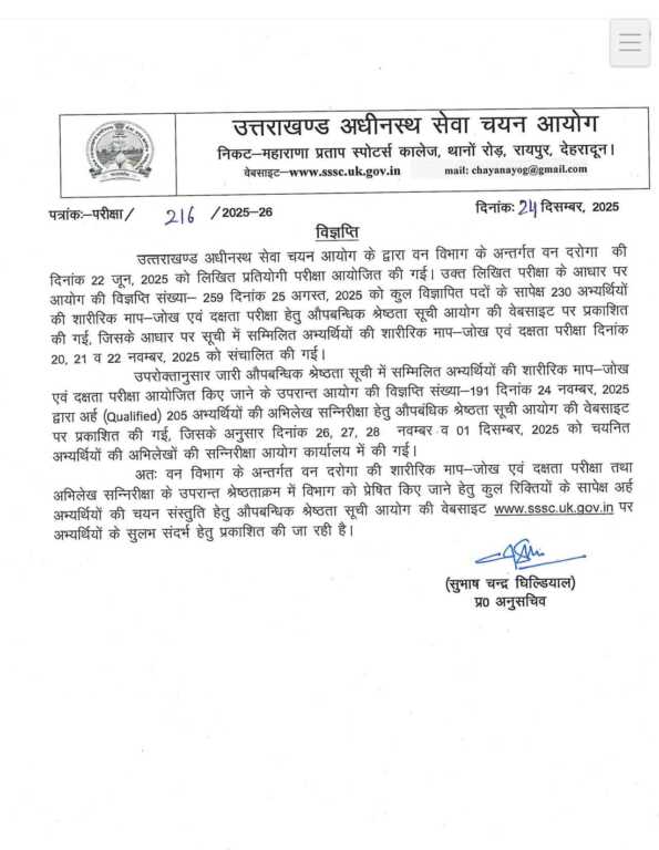 उत्तराखण्ड अधीनस्थ सेवा चयन आयोग के द्वारा वन विभाग के अन्तर्गत वन दरोगा की दिनांक 22 जून, 2025 को लिखित प्रतियोगी परीक्षा आयोजित की गई। उक्त लिखित परीक्षा के आधार पर आयोग की विज्ञप्ति संख्या- 259 दिनांक 25 अगस्त, 2025 को कुल विज्ञापित पदों के सापेक्ष 230 अभ्यर्थियों की शारीरिक माप-जोख एवं दक्षता परीक्षा हेतु औपबन्धिक श्रेष्ठता सूची आयोग की वेबसाइट पर प्रकाशित की गई, जिसके आधार पर सूची में सम्मिलित अभ्यर्थियों की शारीरिक माप-जोख एवं दक्षता परीक्षा दिनांक 20, 21 व 22 नवम्बर, 2025 को संचालित की गई।