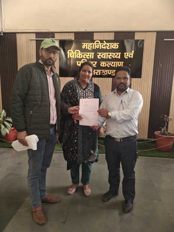 शासनादेश की प्रति उपलब्ध करने के लिए सभी अधिकारियों और कर्मचारियों का संगठन ने धन्यवाद प्रेषित किया,आज के प्रतिनिधि मंडल में नर्सिंग बेरोजगार संघ की पूर्व अध्यक्षा श्रीमती मीनाक्षी मंमगाई, पूर्व उपाध्यक्ष शैलेश राणा, प्रभा, शीतल, मोनिका, सौरभ, गिरीश मनजीत,पंकज, विनोद,मनवीर, आदि नर्सिंग अधिकारी उपस्थित रहे