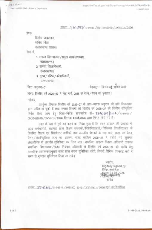 जिसमें यह व्यवस्था है कि विधानसभा द्वारा वर्ष २०२६-२७ पारित बचत की व्यवस्था के अनुरूप बजट जारी होने की प्रत्याशा में समस्त कार्मिकों के माह मार्च २०२६ का वेतन आहरित कर उपलब्ध करा दिया जाए।
