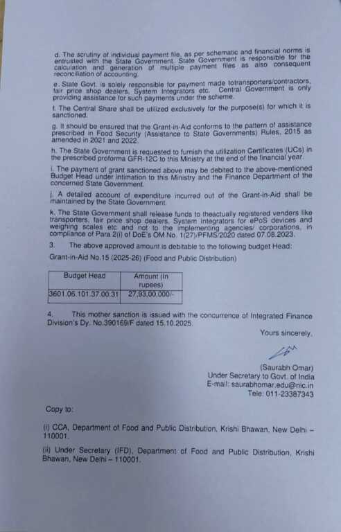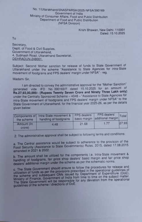 *देहरादून, 15 अक्टूबर।* प्रदेश के राशन विक्रेताओं के लिए अच्छी खबर है। केंद्र सरकार ने उत्तराखंड को राशन विक्रेताओं के बकाया लाभांश और भाड़े के भुगतान के लिए 27 करोड़ 93 लाख रुपये की धनराशि जारी कर दी है।