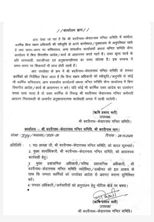 रावल की नाराजगी के बाद धाम में दर्शनों व पूजा के नाम पर हो रहे खेल और अव्यवस्थाओं को लेकर तमाम तरह की चर्चाएं हो रही हैं। हाल ही में बीकेटीसी के उपाध्यक्ष ऋषि प्रसाद सती द्वारा जारी कार्यालय ज्ञाप भी सोशल मीडिया पर वायरल हुआ, जिसमें सती ने कहा कि बीकेटीसी कार्मिक बिना सक्षम अधिकारी की स्वीकृति के अपने कार्यस्थल/ मुख्यालय से अनुपस्थित रहते हैं और सचिवालय, अन्य शासकीय कार्यालयों अथवा कैंप कार्यालय में बिना आदेश के आवागमन करते रहते हैं।