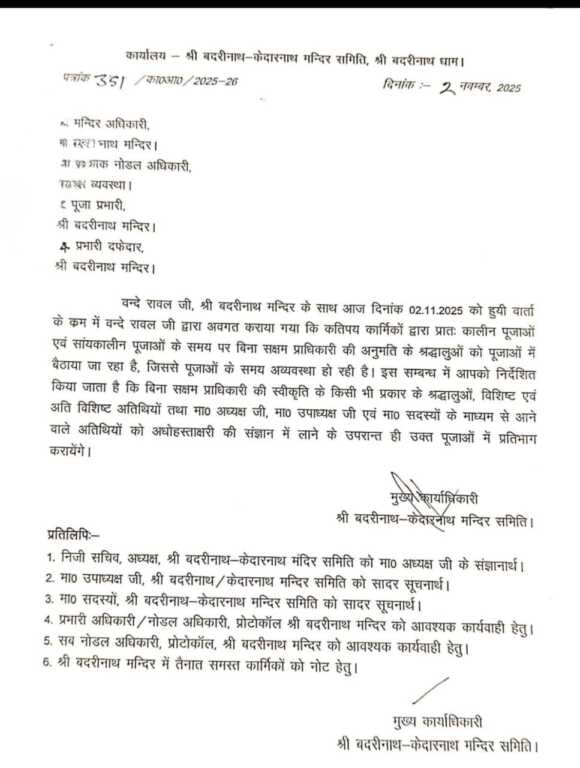 *बदरीनाथ में विशेष पूजा को लेकर रावल के ऐतराज से मचा हड़कंप, अब सीईओ की अनुमति से ही बैठ सकेंगे पूजाओं में*