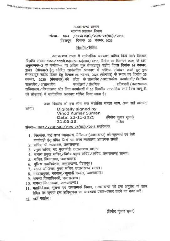 उत्तराखण्ड राज्य में सार्वजनिक अवकाश घोषित किये जाने विषयक विज्ञप्ति संख्या-1958/xxxi (15) G/24-74 (सा0)/2016, दिनांक 30 दिसम्बर, 2024 के द्वारा अनुलग्नक-2 के कमांक 4 पर अंकित गुरू तेगबहादुर शहीद दिवस दिनांक 24 नवम्बर, 2025 (सोमवार) हेतु घोषित सार्वजनिक अवकाश में आंशिक संशोधन करते हुए गुरू तेगबहादुर शहीद दिवस हेतु दिनांक 24 नवम्बर, 2025 (सोमवार) के स्थान पर दिनांक 25 नवम्बर, 2025 (मंगलवार) को प्रदेश के शासकीय/अशासकीय कार्यालयों/शैक्षणिक शासकीय/अशासकीय कार्यालयों / शैक्षणिक प्रतिष्ठानों (उत्तराखण्ड सचिवालय / विधानसभा और जिन कार्यालयों में 05 दिवसीय साप्ताहिक कार्यदिवस लागू है, को छोड़कर) में सार्वजनिक अवकाश घोषित किया जाता है।