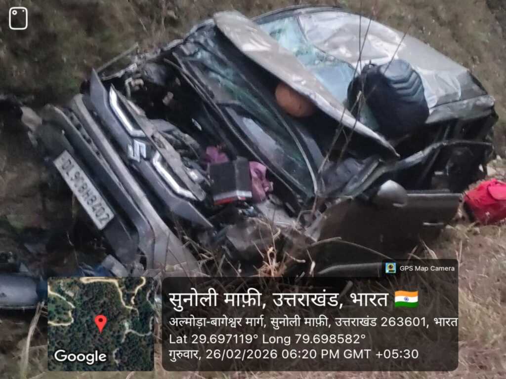 घटनास्थल पर पहुंचने पर ज्ञात हुआ कि वाहन (Brezza संख्या DL9CBH8402) अनियंत्रित होकर गहरी खाई में दुर्घटनाग्रस्त हो गया था। वाहन में कुल 08 व्यक्ति सवार थे, जो बारात से लौटते समय अल्मोड़ा की ओर आ रहे थे।