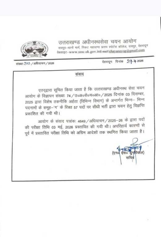 उत्तराखंड अधीनस्थ सेवा चयन आयोग ने 18 विभागों में अलग-अलग 57 समूह-ग पदों पर भर्ती की परीक्षा स्थगित कर दी है। यह परीक्षा तीन मई को होनी थी। अब इसकी नई तिथि जारी की जाएगी।