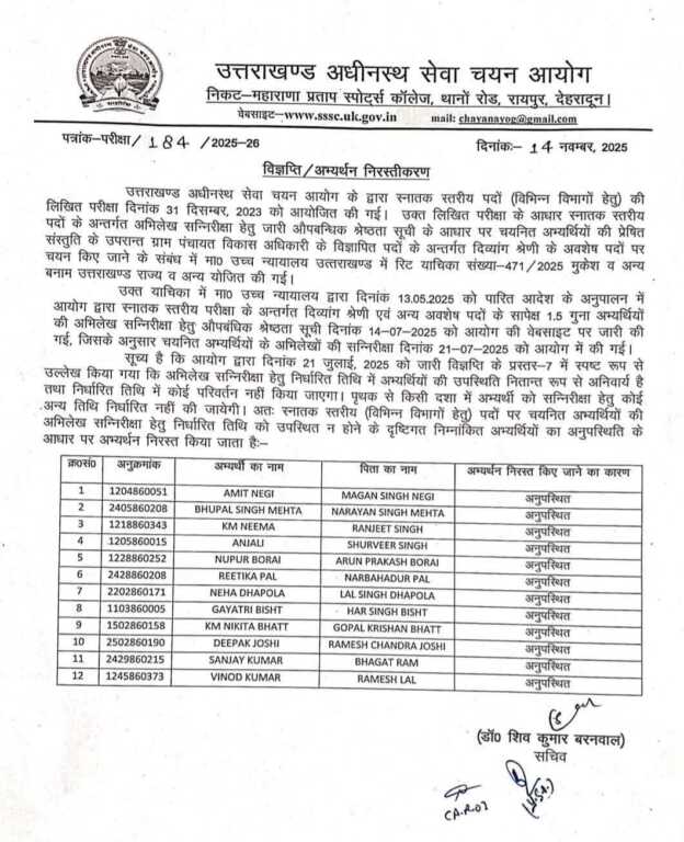 सूच्य है कि आयोग द्वारा दिनांक 21 जुलाई, 2025 को जारी विज्ञप्ति के प्रस्तर-7 में स्पष्ट रूप से उल्लेख किया गया कि अभिलेख सन्निरीक्षा हेतु निर्धारित तिथि में अभ्यर्थियों की उपस्थिति नितान्त रूप से अनिवार्य है तथा निर्धारित तिथि में कोई परिवर्तन नहीं किया जाएगा। पृथक से किसी दशा में अभ्यर्थी को सन्निरीक्षा हेतु कोई अन्य तिथि निर्धारित नहीं की जायेगी। अतः स्नातक स्तरीय (विभिन्न विभागों हेतु) पदों पर चयनित अभ्यर्थियों की अभिलेख सन्निरीक्षा हेतु निर्धारित तिथि को उपस्थित न होने के दृष्टिगत निम्नांकित अभ्यर्थियों का अनुपस्थिति के कारण अभयर्थन निरस्त किया जाता है