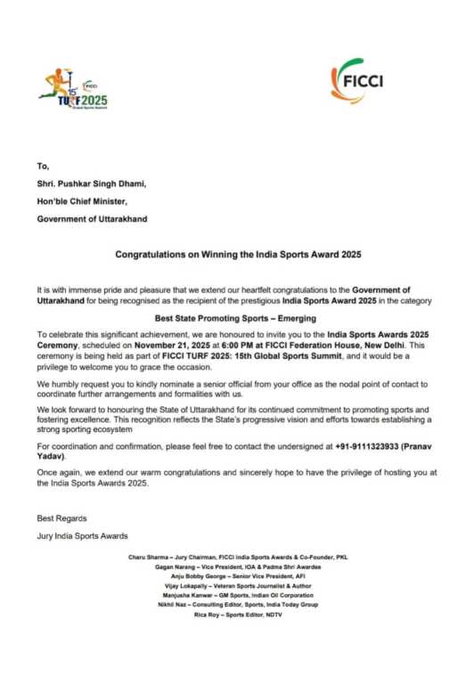 *उत्तराखंड को “FICCI द्वारा आयोजित ‘इंडिया स्पोर्ट्स अवार्ड 2025’ में सर्वश्रेष्ठ उभरता राज्य का खिताब*