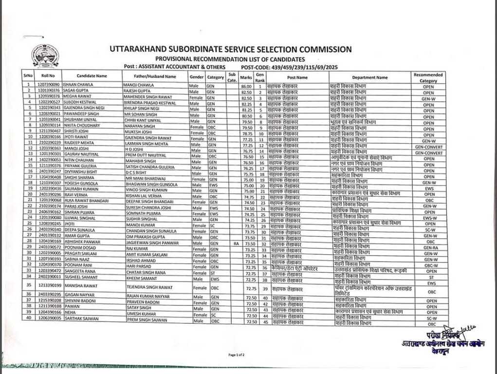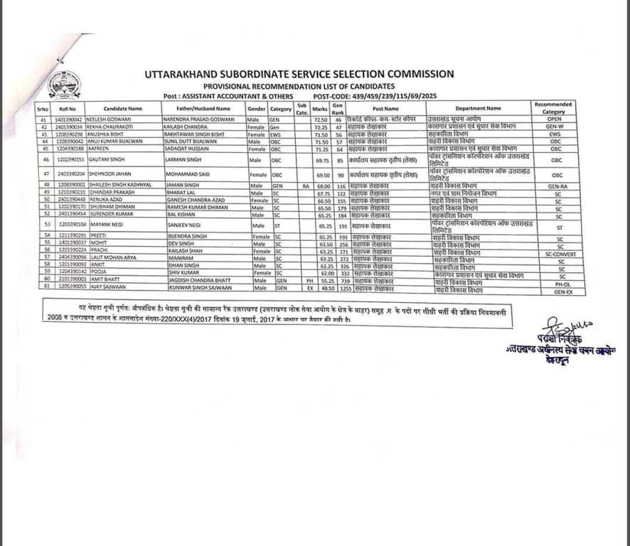 उत्तराखंड अधीनस्थ सेवा चयन आयोग सहायक लेखाकार परीक्षा परिणाम घोषित।।