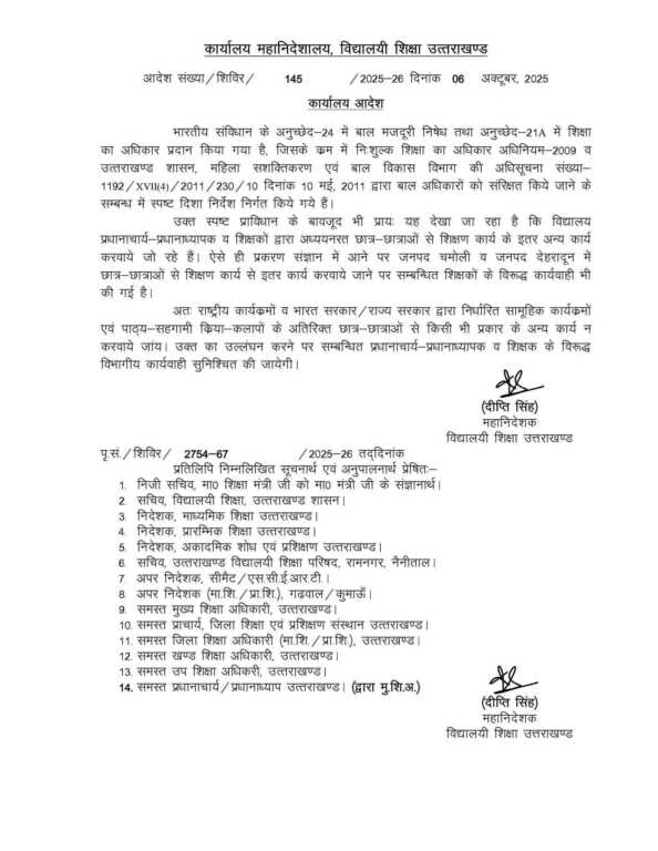 अतः राष्ट्रीय कार्यक्रमों व भारत सरकार/राज्य सरकार द्वारा निर्धारित सामूहिक कार्यक्रमों एवं पाठ्य सहगामी किया-कलापों के अतिरिक्त छात्र-छात्राओं से किसी भी प्रकार के अन्य कार्य न करवाये जांय। उक्त का उल्लंघन करने पर सम्बन्धित प्रधानाचार्य-प्रधानाध्यापक व शिक्षक के विरूद्ध विभागीय कार्यवाही सुनिश्चित की जायेगी।