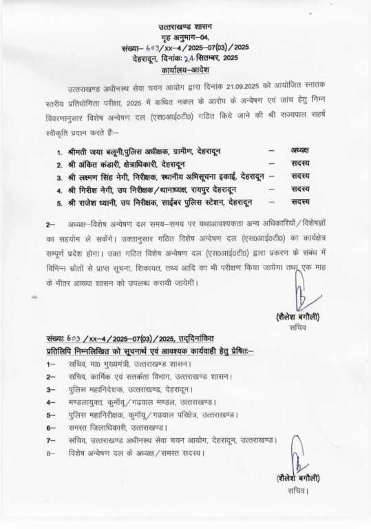 दिनांक 21.09.2025 को उत्तराखण्ड अधीनस्थ सेवा चयन आयोग द्वारा आयोजित स्नातक स्तरीय प्रतियोगिता परीक्षा, 2025 में कथित नकल के आरोपों की गंभीरता को देखते हुए राज्य सरकार द्वारा एक विशेष अन्वेषण दल (SIT) गठित किया गया है। यह दल मामले की समुचित जांच करेगा और एक माह के भीतर शासन को अपनी आख्या प्रस्तुत करेगा।