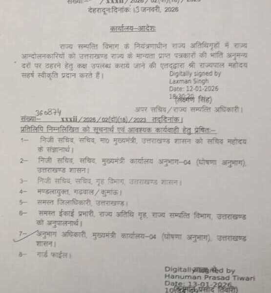 राज्य सम्पत्ति विभाग के नियंत्रणाधीन राज्य अतिथिगृहों में राज्य आन्दोलनकारियों को उत्तराखण्ड राज्य के...