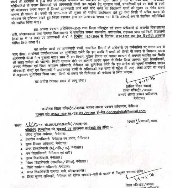 जनपद नैनीताल के विकासखण्ड धारी, ओखलकाण्डा, रामगढ़ क्षेत्रों में विगत दिनों से मानव वन्यजीव...