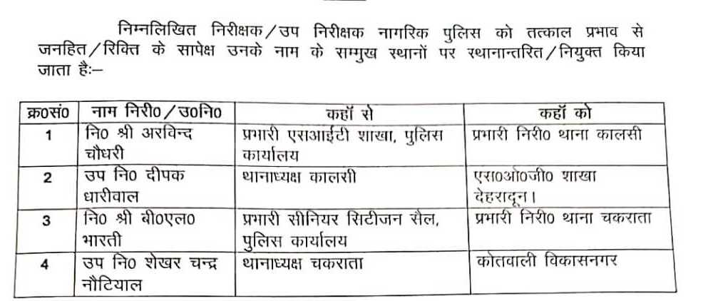 *आज दिनांक 04/02/2026 को वरिष्ठ पुलिस अधीक्षक देहरादून द्वारा निम्न निरीक्षकों/उप निरीक्षकों के स्थानांतरण...
