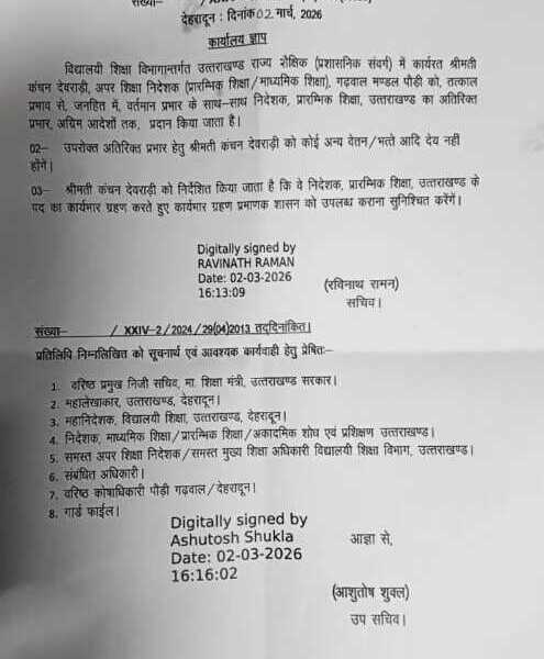 विद्यालयी शिक्षा विभागान्तर्गत उत्तराखण्ड राज्य शैक्षिक (प्रशासनिक संवर्ग) में कार्यरत श्रीमती कंचन देवराड़ी, अपर...