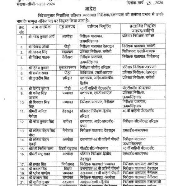 Big breaking :-चारधाम यात्रा के सुरक्षित संचालन एवं यातायात व्यवस्था सुदृढ़ करने के उद्देश्य से 51 दलनायकों का विभिन्न इकाइयों में स्थानांतरण
