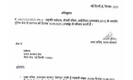 *आईपीएस अधिकारी रचिता जुयाल का इस्तीफा स्वीकार, 16 सितंबर से सेवा मुक्त* नई दिल्ली। केंद्र सरकार ने उत्तराखंड कैडर की आईपीएस अधिकारी...